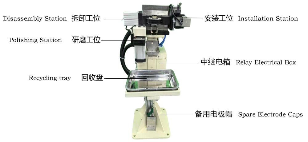 电极帽在工业机器人的移动配合下 ,沿电极杆轴线方向移动拆除电极帽 。 安装过程与拆卸过程类似但方向相反 。当从固定焊钳拆卸下电极帽后 ,机器 人控制柜向机器人发出安装电极帽请求 。安装完成后 ,驱动焊接机器人移动至 焊接工位前继续进行焊接工作 。 当机器人电焊达到设定的焊点数量后 ,机器人会自动调用研磨程序 。